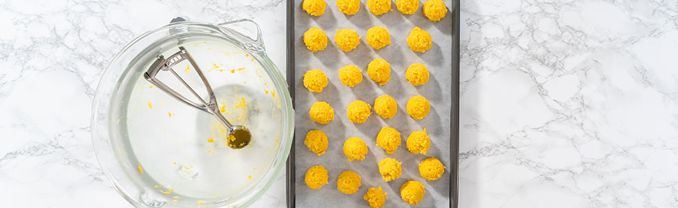 6. Forma bolitas de masa, colócalas en la bandeja dejando espacio entre cada una y aplánalas ligeramente.