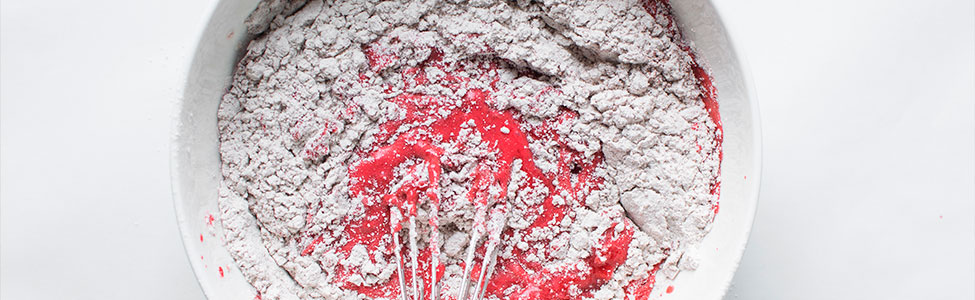 2. En otro bowl bate las piezas de huevo con el aceite, un chorrito de Vainilla Molina y el colorante rojo. La mezcla debe quedar pareja.